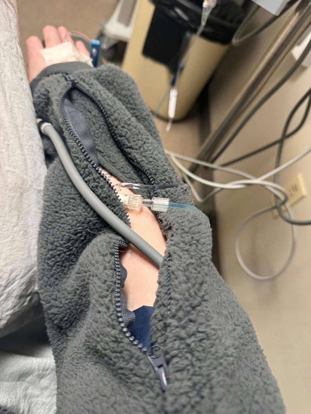 I thought I loved the IV hoodies, but this is a whole new level! I had the IV line to my port through the zipper on one arm, and the hospital bracelet bar code through the zipper on the other! The nurses could access everything they needed while I stayed cozy (gotta love those thumb holes)!