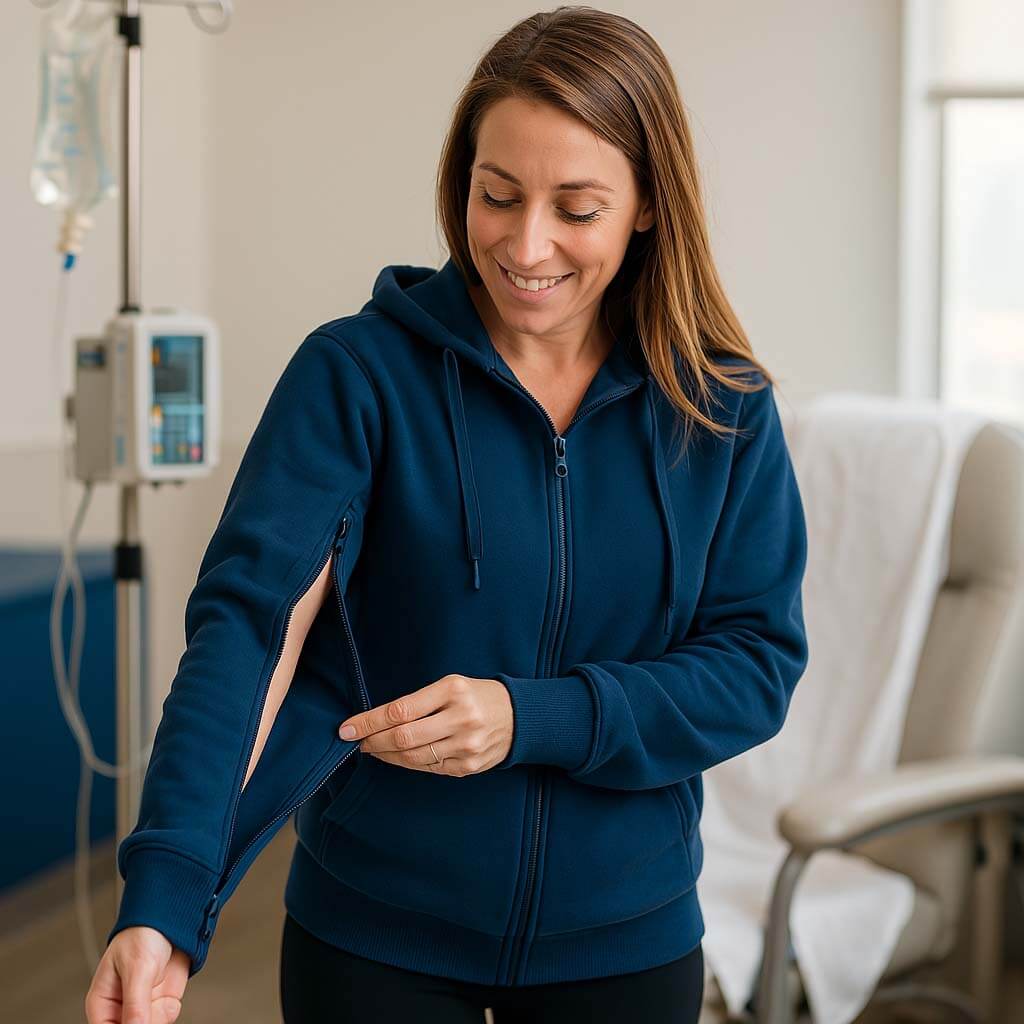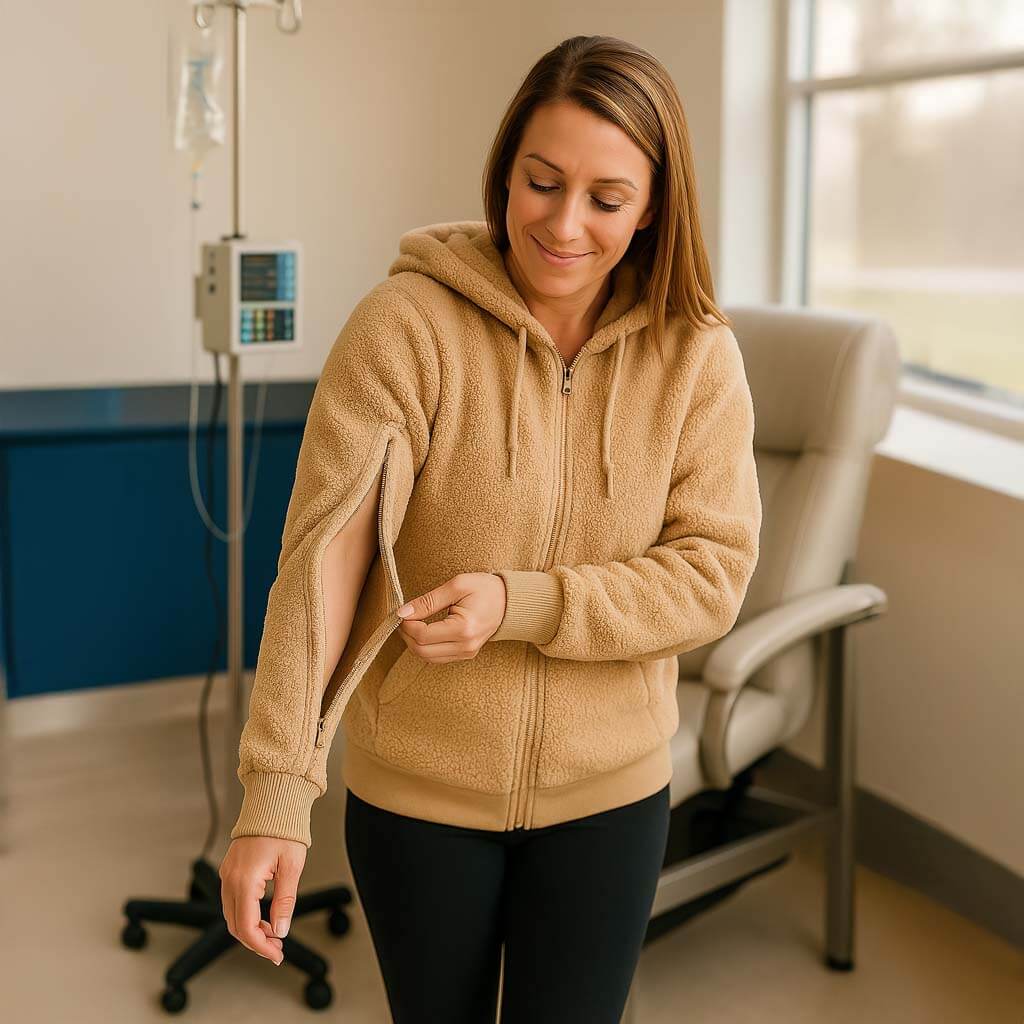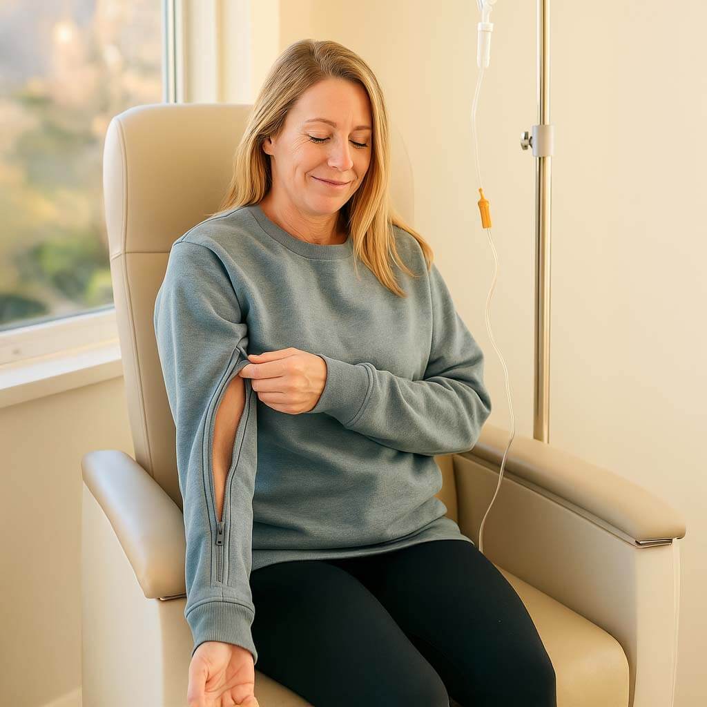 “Finally, something I don’t have to fight with on infusion days. The arm zippers are a lifesaver.”
