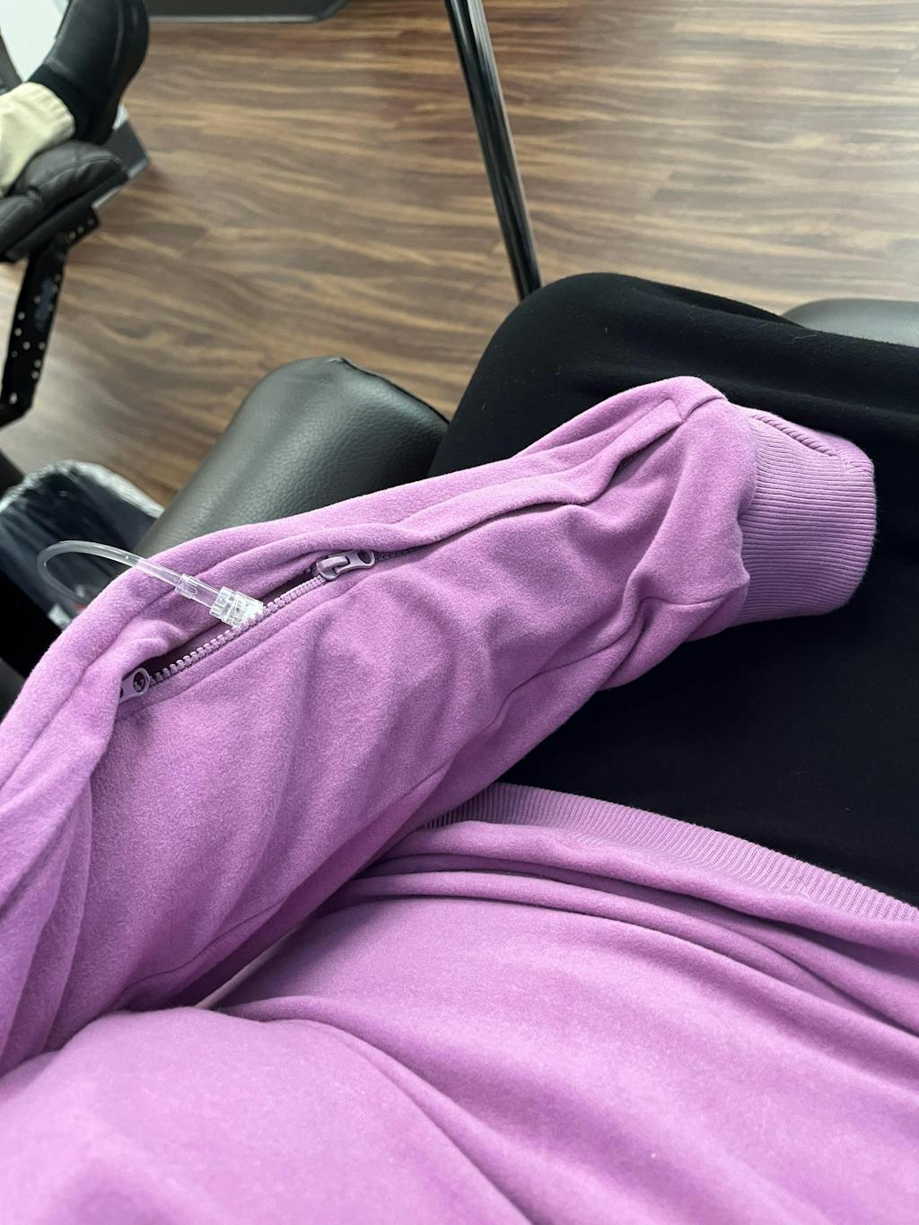 Regular sweatshirts require rolling up sleeves or removing your top for IV access. This crewneck eliminates that hassle with hidden zippers while still being soft and stylish.