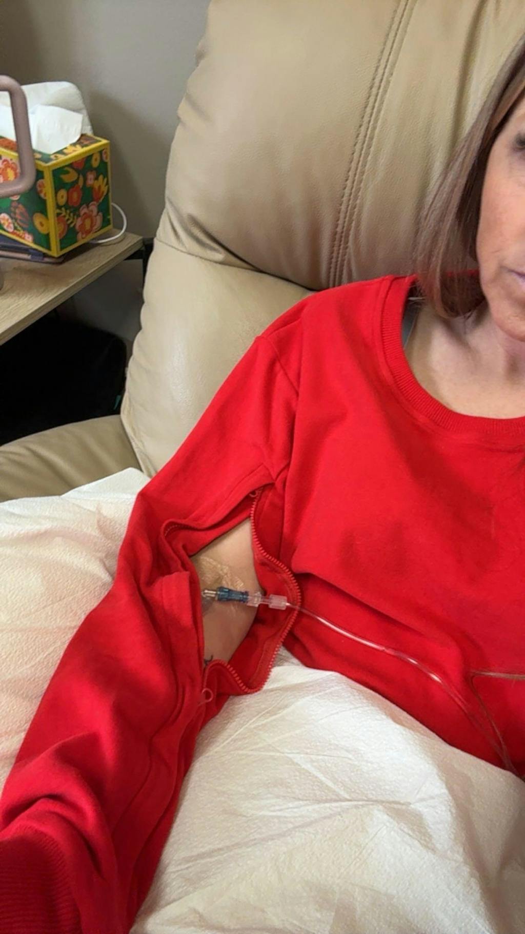 It’s designed with hidden zippers on both sleeves for IV and PICC line access, so you don’t have to roll up sleeves or remove layers during treatment.
