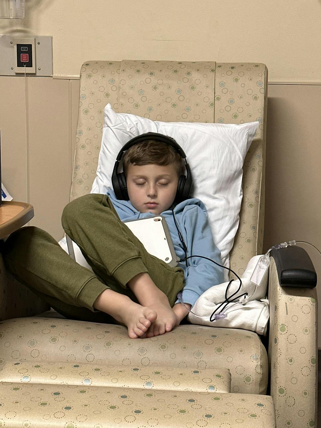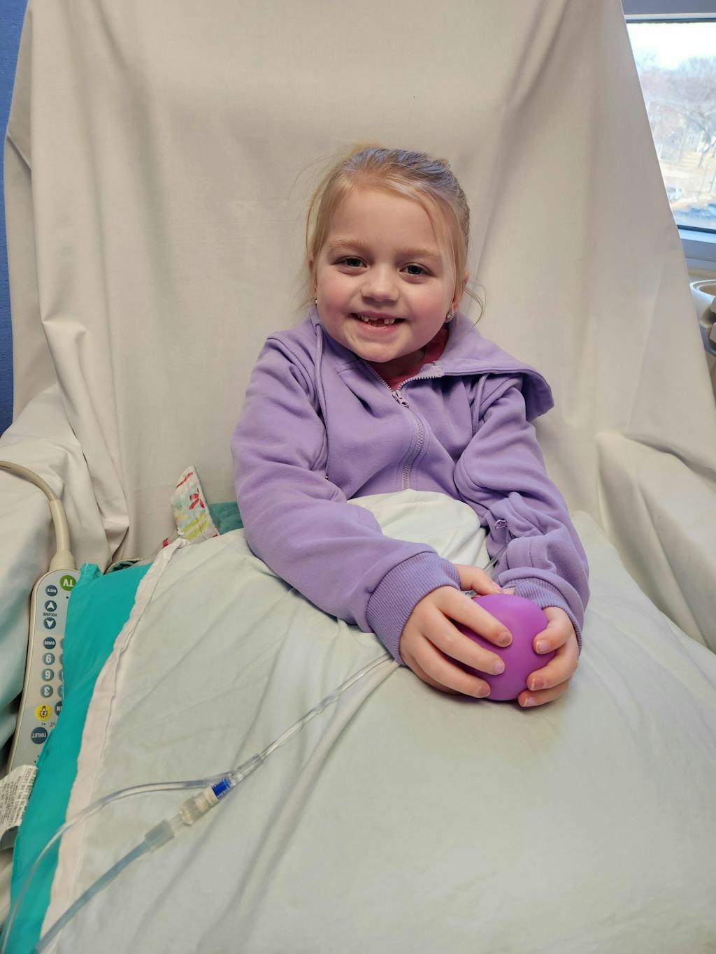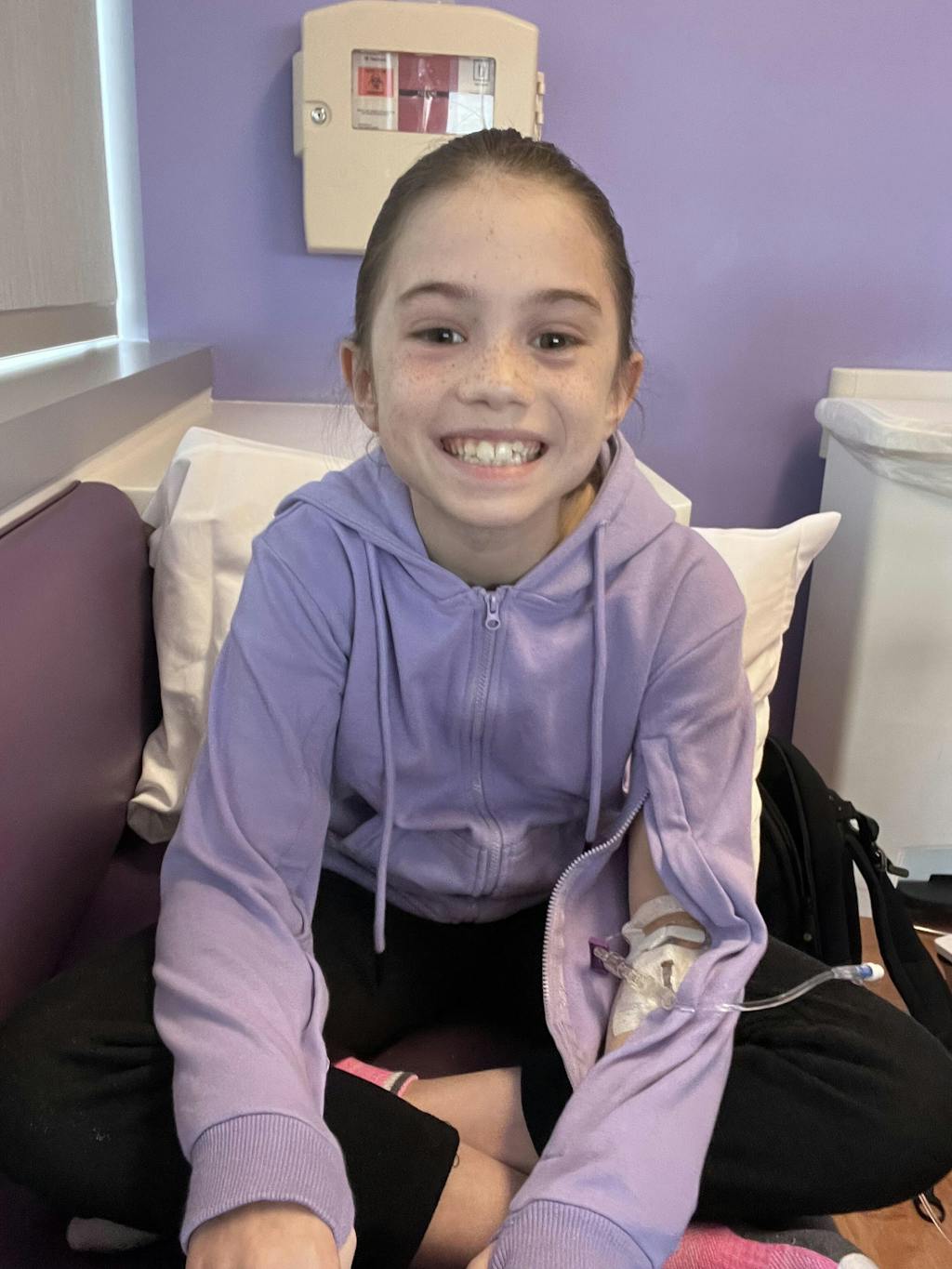 It eliminates the hassle of removing layers for IV access, reduces stress for both kids and parents on treatment days, and keeps kids warm and comfortable while maintaining a sense of normalcy and style.